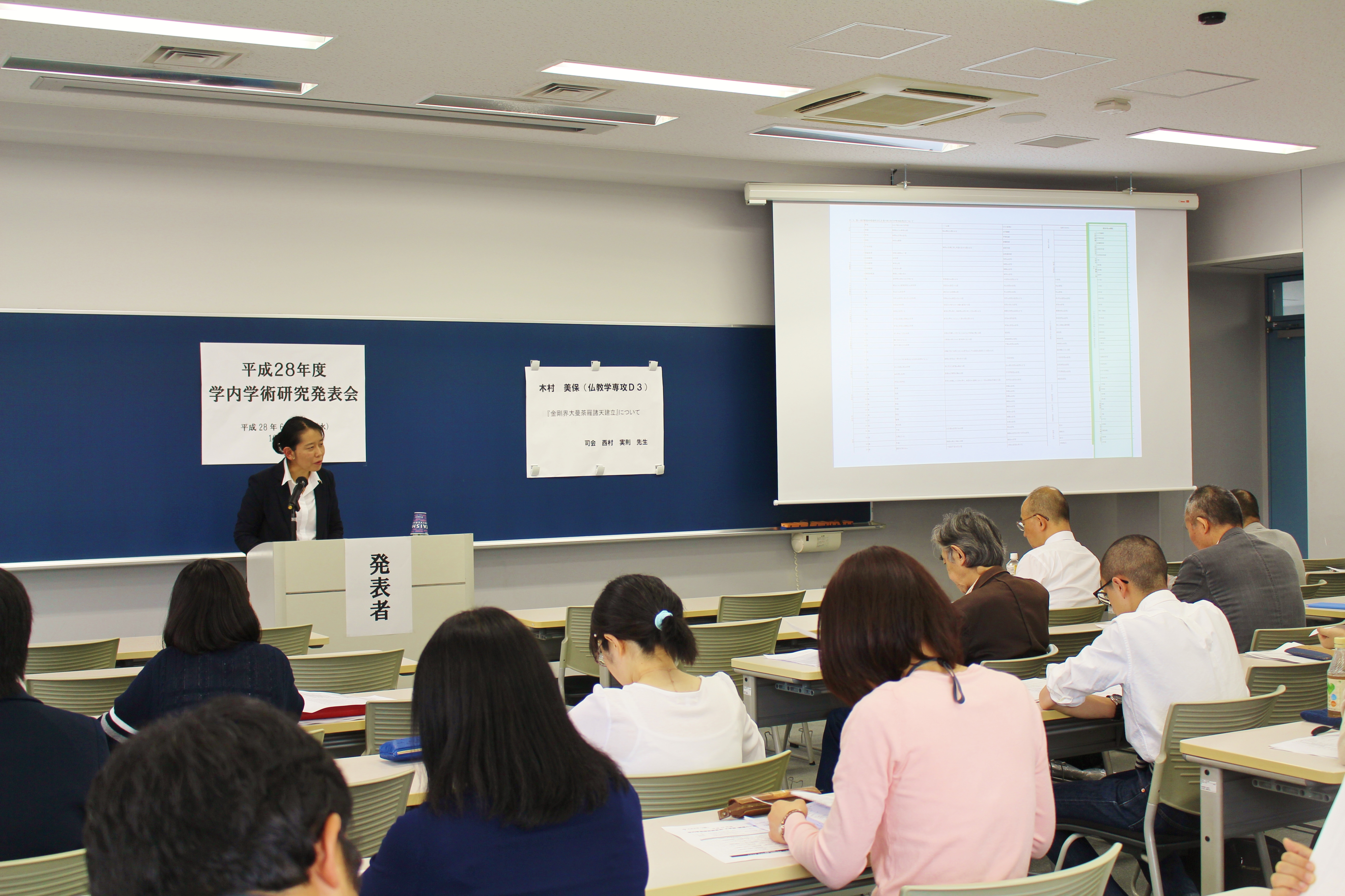 本日、13時30分より、学内学術研究発表会を実施いたしました。仏教学専攻、福祉・臨床心理学専攻、史学専攻、宗教学専攻の博士課程の学生による発表が行われました。