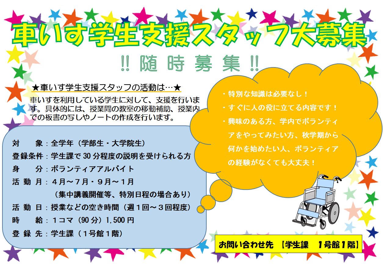 学生課では車いすを利用している学生に対して、支援を行っています。具体的には、授業間の教室の移動補助、授業内での板書やノートを作成することです。