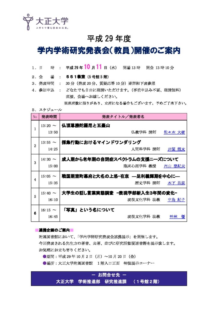 今年度も教員による学内学術研究発表会を2017年10月11日(水)に開催いたします。