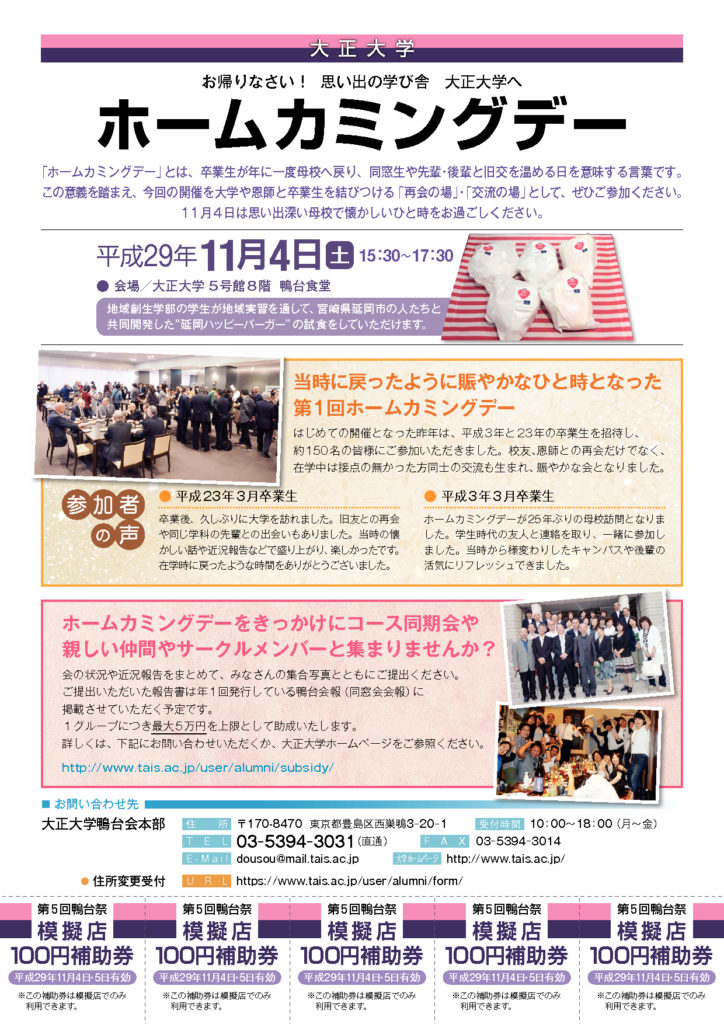 大正大学では学園祭開催期間に合わせ、卒業生を対象としたホームカミングデーを開催いたします。