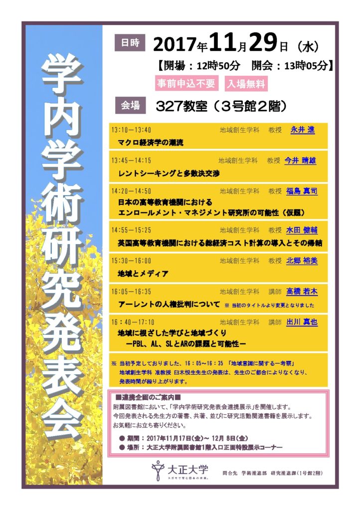 2017年11月29日(水)に地域創生学科の教員による学内学術研究発表会を開催します。