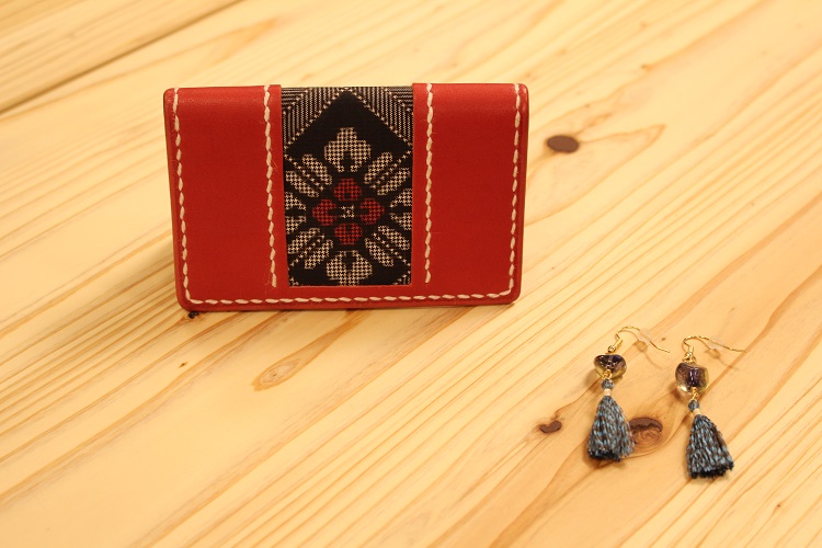 (奄美大島の名産であり世界三大織物に選ばれる「大島紬」で作られた名刺入れとピアス)