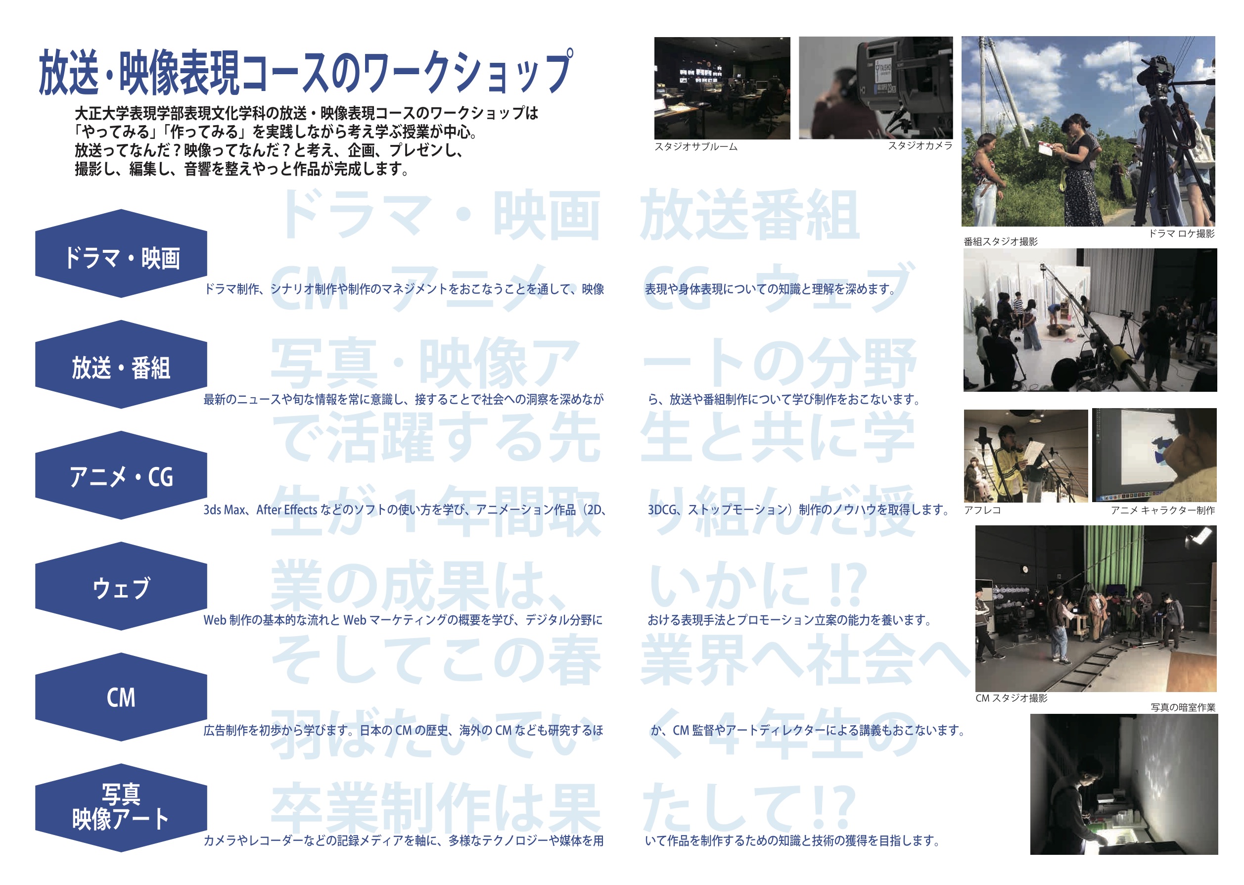 大正大学では、映像や文章表現、エンターテインメントビジネス等を学ぶことが出来る「表現学部」を擁し、テレビ番組制作会社、映像関連企業、出版社等の現場で活躍できる人材を育成しています。放送・映像表現コースでは映像や音声メディア、Webコンテンツについて企画から制作、仕上げまでを実際に現場で働く教員から実践的に学び、アニメ、3DCG、映画、CM、ドラマなどのコンテンツを制作する力を身に付けます。また、大学の施設としてプロユースの放送機器を備えた約40坪のスタジオを持っており、テレビ局と同レベルの本格的な環境の中で日々学びを深めています。インターンシップ等の実際の制作現場を経験させることにも力を入れており、知識と現場経験を積んだ人材を映像制作会社、テレビ番組制作会社などに輩出しています。