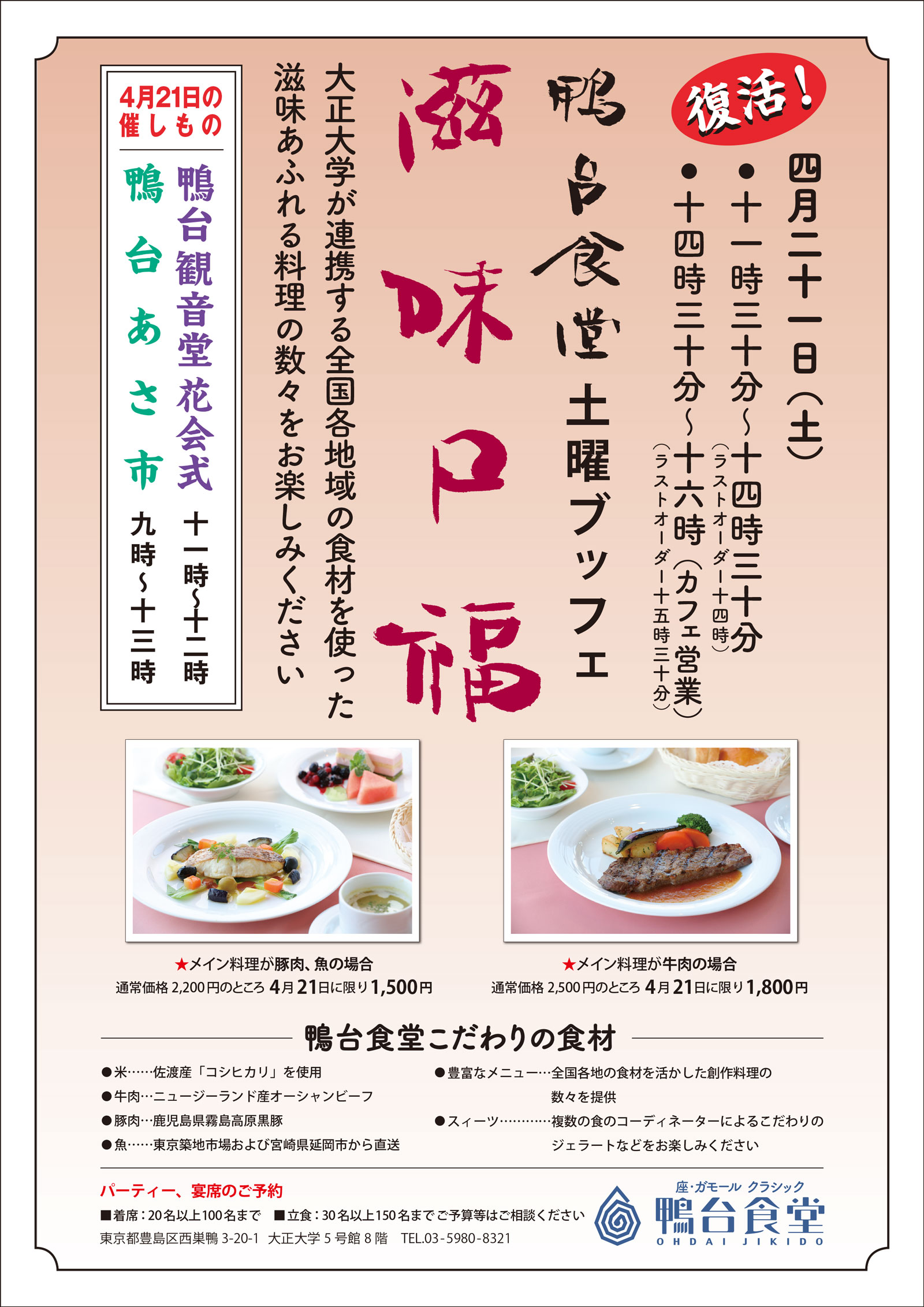 4/21(土)鴨台食堂の土曜ビュッフェが復活します
