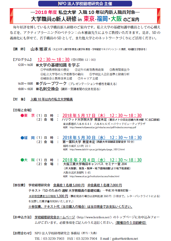 人間学部 教育人間学科 山本雅叔先生が講師をされる『大学職員の新人研修2018』が全国各地で開催されます。