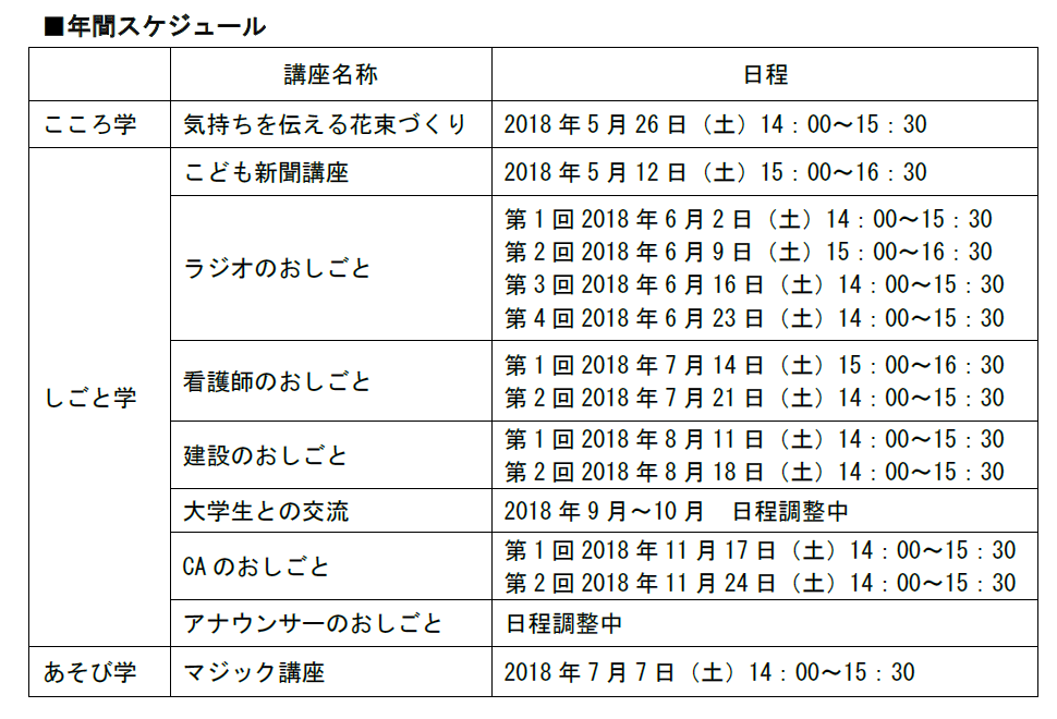 「しごと学」:新聞記者、ラジオパーソナリティー、看護師、客室乗務員、アナウンサーなど、職業を実際に体験して、こどもらしい夢を抱くきっかけを提供します。