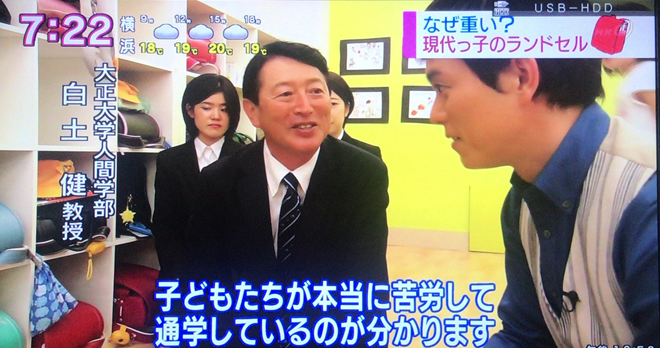 白土教授が都内の学童施設でランドセルの重さを調査している様子が放映され、