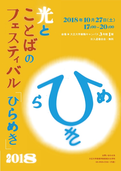 大正大学(学長:大塚伸夫、所在地:東京都豊島区) では、2018年10月27日(土)に『光とことばのフェスティバル2018~ひらめき~』を開催します。