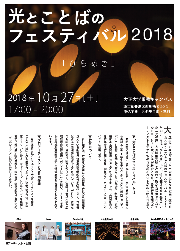 3,000基の竹灯篭が灯す「光の道」『光とことばのフェスティバル2018 ~ひらめき~』開催―2018年10月27日(土)17:00~ 会場:大正大学―