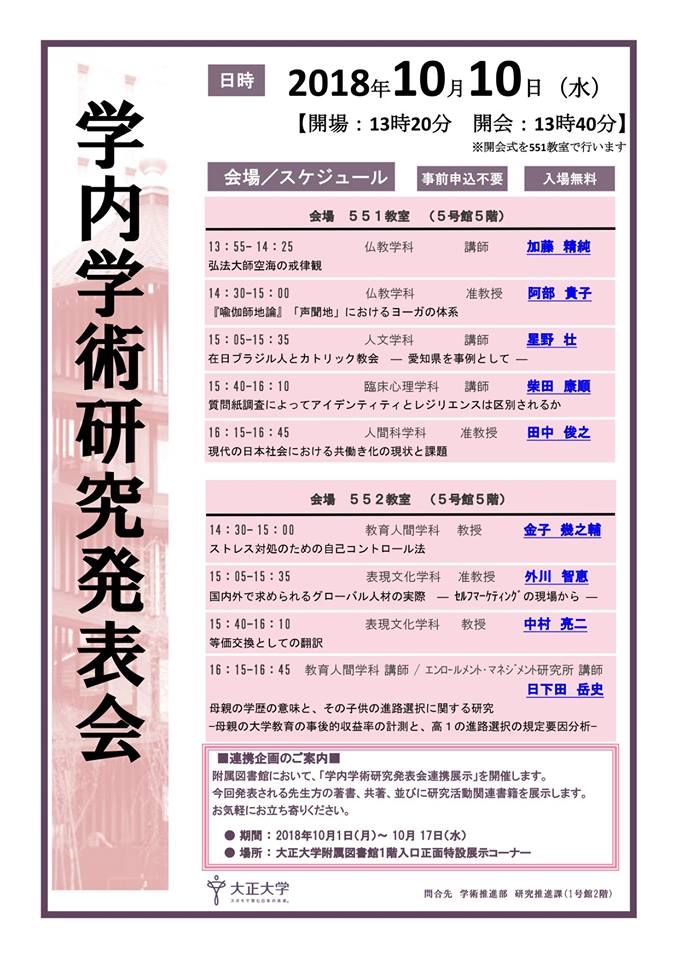10月10日(水)に「平成30年度 学内学術研究発表会」を開催し、総計約190名の学生・教職員が参加しました。