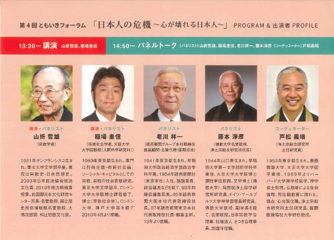 2018年12月8日(土)大正大学の設立宗派である浄土宗が100年前に設立した公益財団法人 浄土宗ともいき財団が主催する『第4回ともいきフォーラム「日本人の危機―心が壊れる日本人―」』を大正大学で開催いたします。