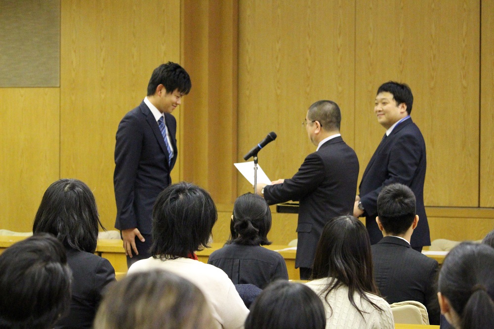 まず、大塚伸夫学長より祝辞を賜り、続いて各奨学制度の代表者へ奨学生証が授与されました。