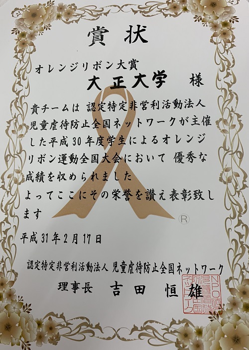 2019年2月17日(日)、国立オリンピック記念青少年センターで開催された「学生による子ども虐待防止オレンジリボン運動の全国大会」(認定NPO 法人 児童虐待防止全国ネットワーク主催)において、社会福祉学科2年生が2018年度の「オレンジリボン運動」の活動を報告し、「オレンジリボン大賞」を受賞しました。