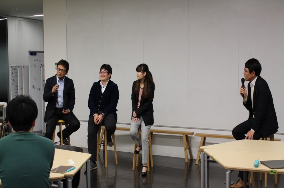 1月17日 キックオフイベントに参加した卒業生の地域・社会イノベ―ター(左から山中氏・幅野氏・石井氏)/右は司会進行役の山本氏