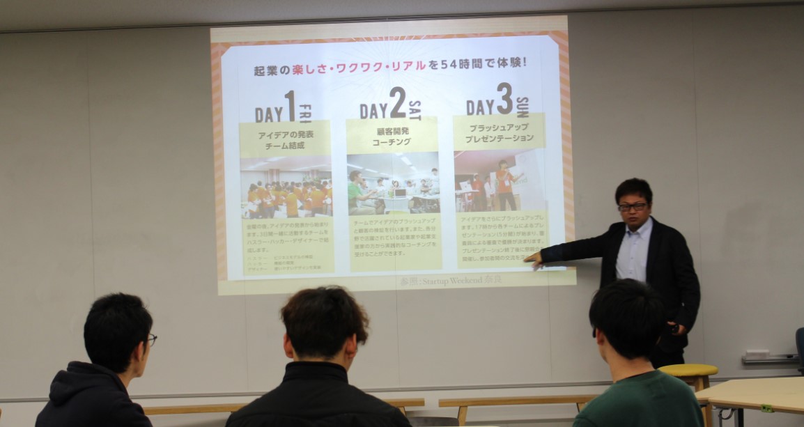 1月17日 キックオフイベントでプログラム説明をする、卒業生で起業家の山中氏(NPO法人JAEファウンダー )