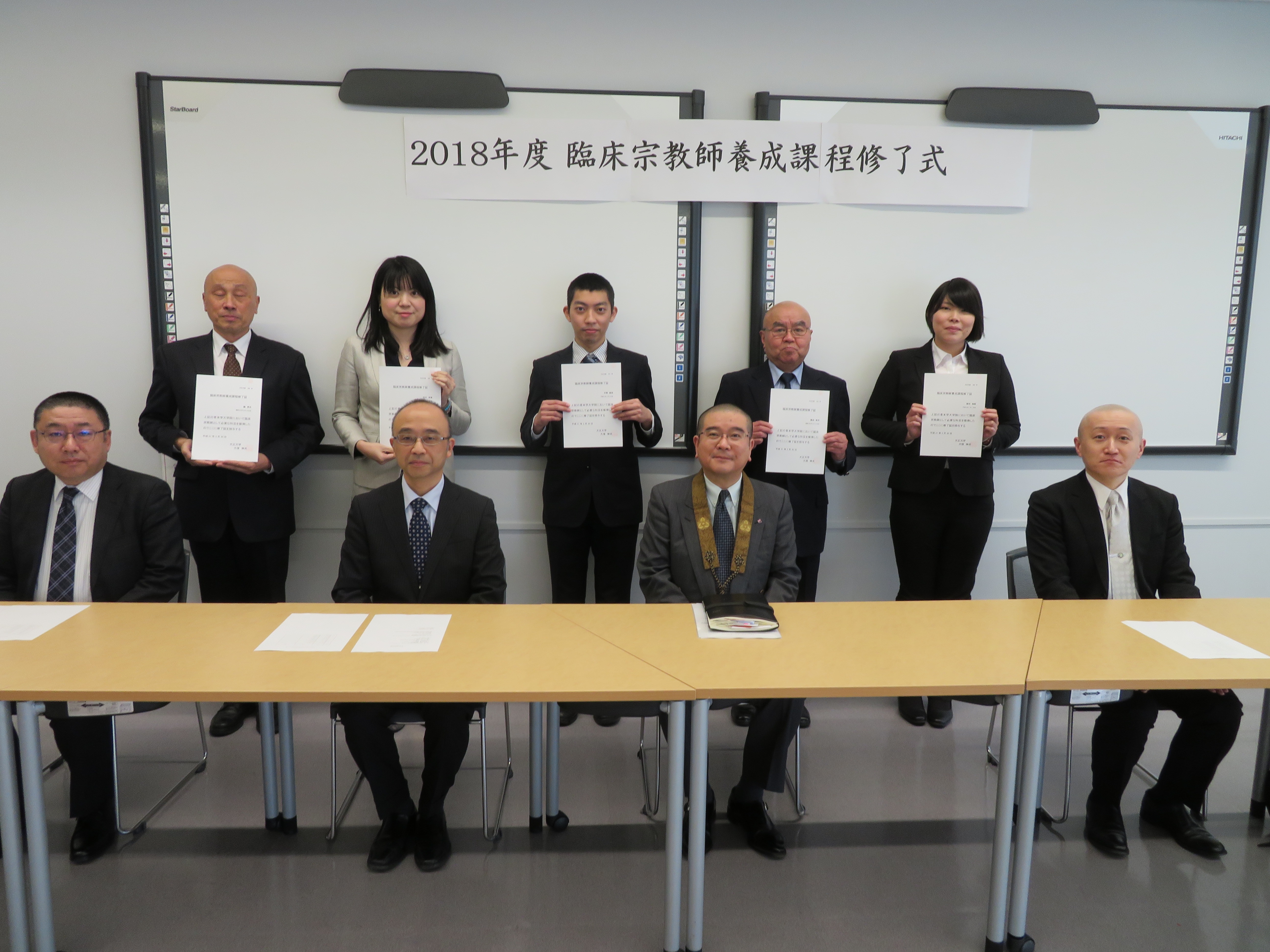 2018年度臨床宗教師修了式を実施しました。2018年度は晴れて6名の学生が修了し、大塚伸夫学長より修了証が授与されました。今後はこの養成課程で学んだことを活かして社会に貢献し、活躍することを期待しています。