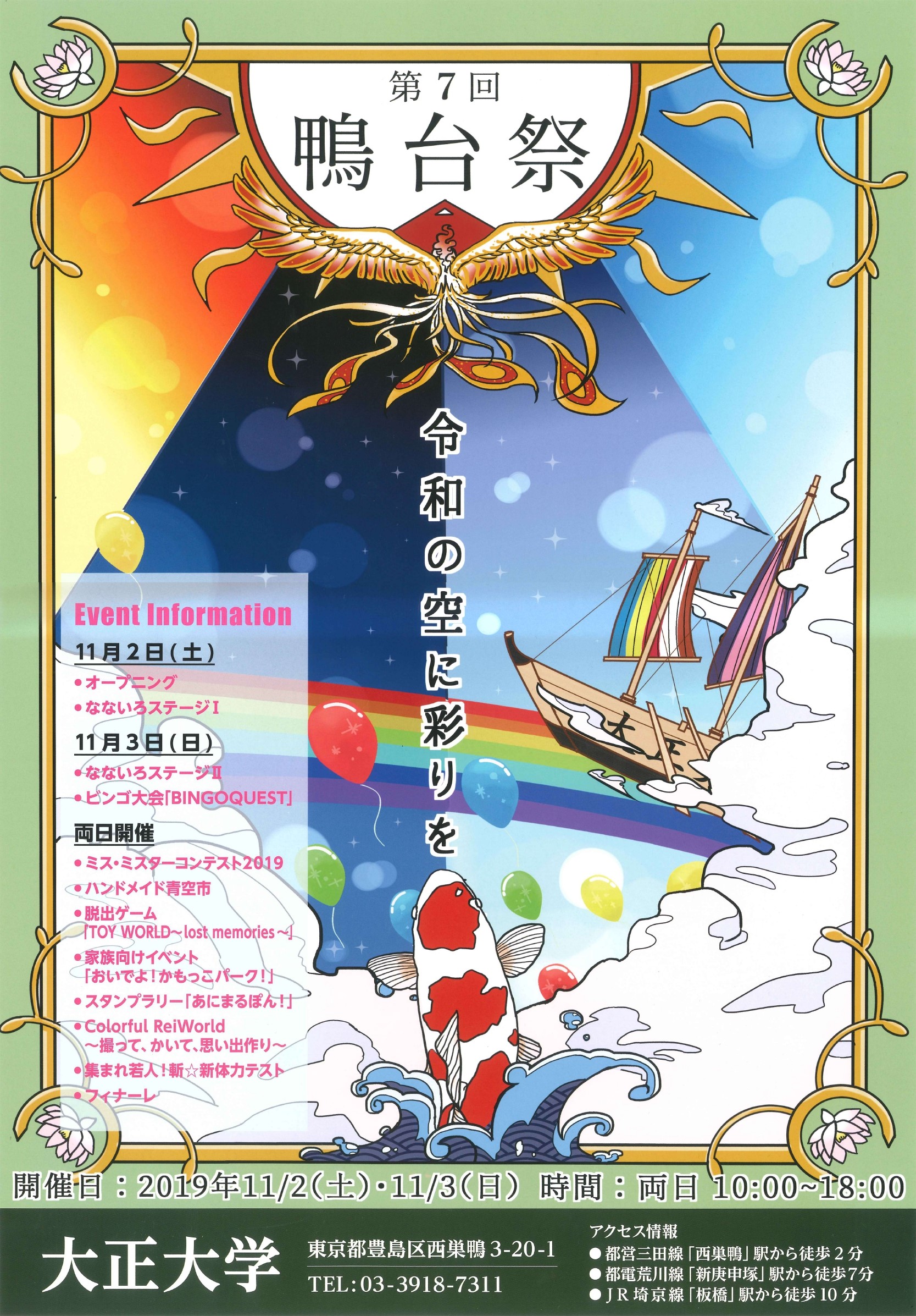 大正大学(学長:大塚伸夫、所在地:東京都豊島区) では、11月2日(土)、3日(日)に、令和最初の学園祭“鴨台祭(おうだいさい)”を開催します。鴨台祭は、学生が企画・運営している巣鴨の地域と一体となり盛り上がる巣鴨エリア最大規模のイベントです。今年のテーマは「令和の空に彩りを」。