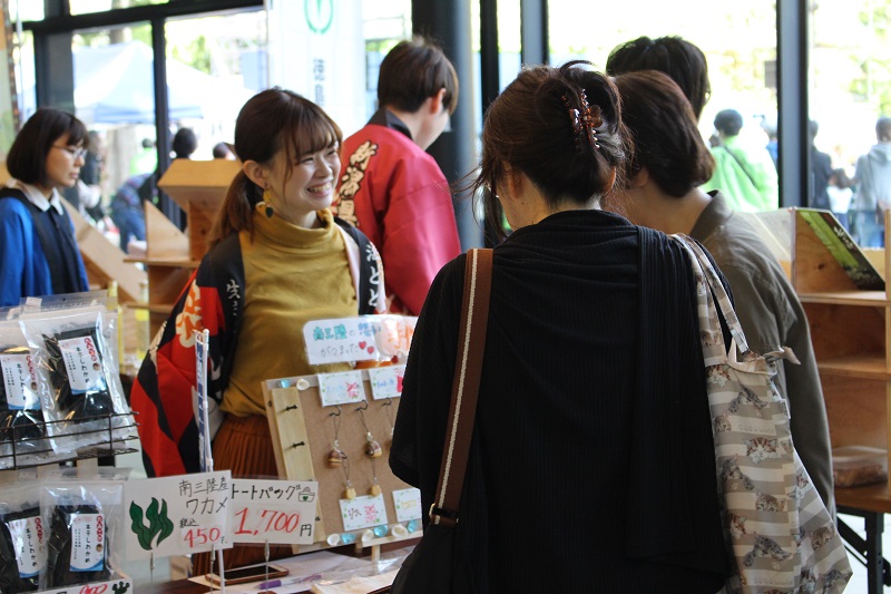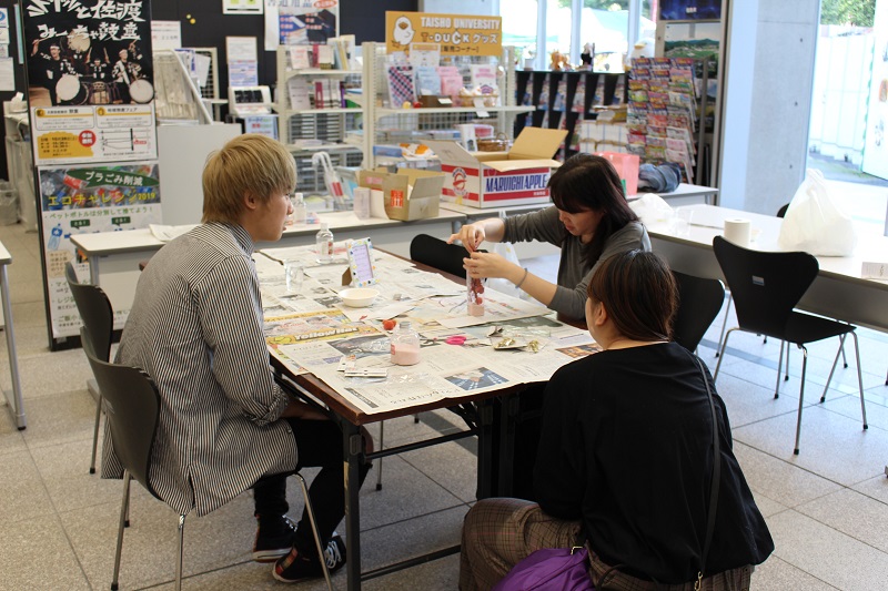 校舎の中では、学生たちが地域実習でお世話になった地域の物産展や実習地の材料を使用したハーバリウムやコースターなどのワークショップも行われました。