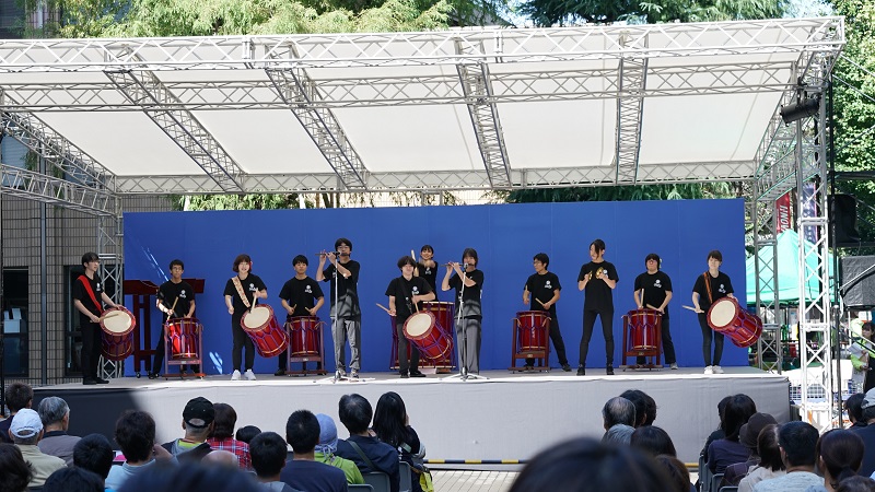 3号館前のステージでは、今年結成された大正大学太鼓部『鼓鴨』の演奏から始まり、巣鴨の太鼓集団『鼓友』、佐渡の太鼓芸能集団『鼓童』の圧巻のパフォーマンスが続きました。