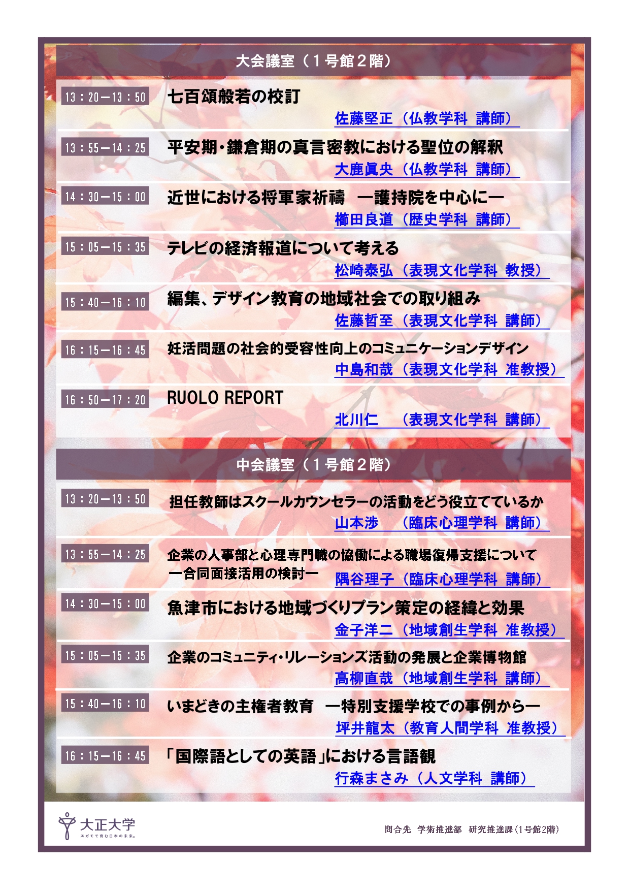 会場は2ヵ所で並行して開催し、13名の教員が研究発表を行いました。