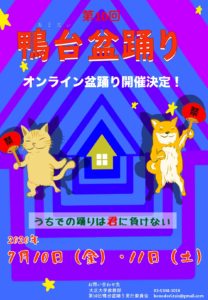 新型コロナウイルス感染症拡大の影響により、毎年大学のキャンパス内で行っていた鴨台盆踊りを、今年度は初の試みである「オンライン盆踊り」として実施することとなりました。