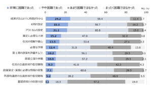 地方創生の第2期スタートに際し、国が強化すべきとして強調している「PDCAサイクルの確立と運用」面で、特に困難度が強く表れた結果となっており、対策が必要であると考えられます。