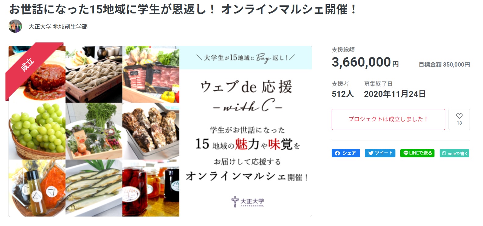昨年度の実習でお世話になった地域の方々に恩返ししようと初挑戦したオンラインマルシェでしたが、11月24日(火)23時、支援総額366万円、全セット完売という素晴らしい結果で終了しました。