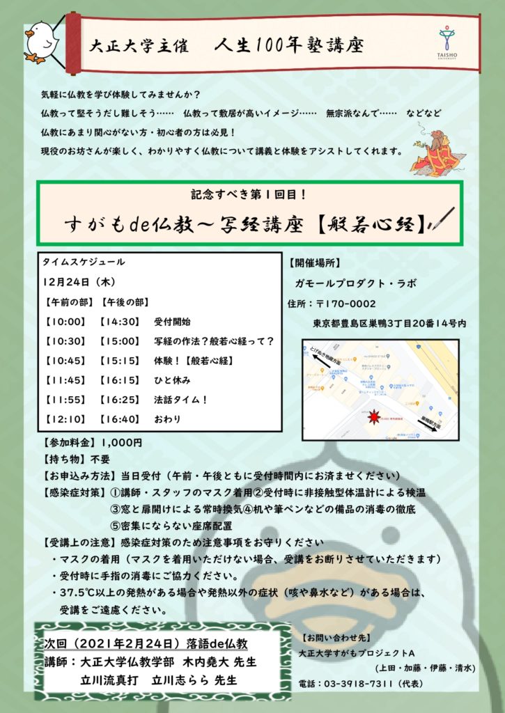 【イベント情報】人生100年塾講座 第1回 すがもde仏教~写経講座【般若心経】開催!