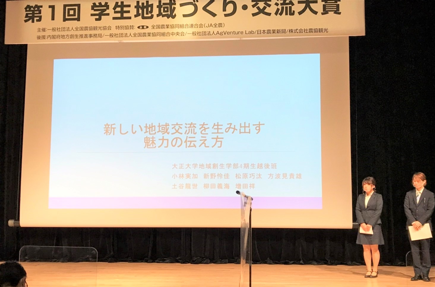 全国19の大学・団体から21の活動事例の応募があり、その中から5校(神戸大学・拓殖大学・東京女子大学(NPO)・三重大学そして大正大学)がファイナリストとして最終プレゼンに臨み、大正大学地域創生学部2年越後班4期生(発表者:小林実加さん、方波見貴雄さん)が審査員特別賞を受賞しました。