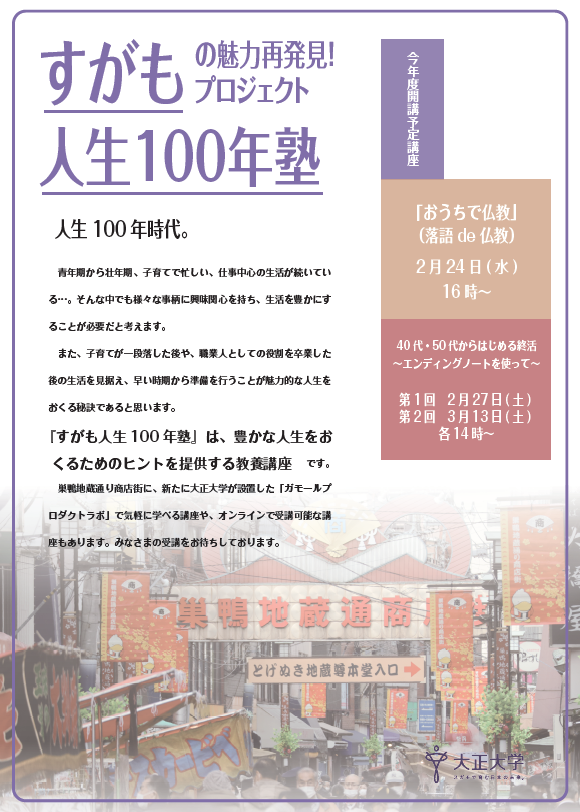 人生100年時代。大正大学では、皆さんが豊かな人生をおくるためのヒントを提供する教養講座「すがも人生100年塾」を開講いたします。