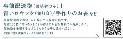 事前申し込みをしていただいた方(先着100名)に、ご自宅で追悼することが出来るセット(学生手作りのオクトパス君型お香と、気仙沼ともしびプロジェクトの青いろうそく等)をご自宅にお届けします。