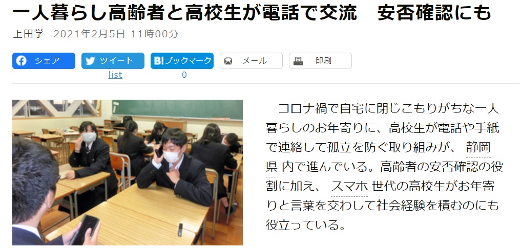 静岡県内の高校生が実施する活動(コロナ禍で自宅に引きこもりがちな一人暮らしをする75歳以上を対象に、週に1回5分間の電話や、月1回の手紙で近況を伝え合う)において、記事中に浦崎太郎教授のコメントが掲載されています。