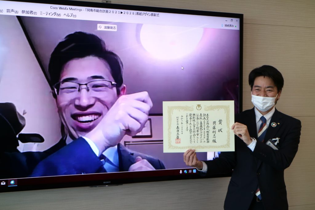 徳島県の阿南市が「総合計画2021▶2028」を策定するに当たり、計画書の表紙・裏表紙のデザインの募集を行い、須藤 剛志さん(地域創生学部2年)のデザインが優秀賞として見事採用されました。表彰式は2月17日(水)にオンラインで開催され、阿南市役所4階市長公室にて表原市長から須藤さんに賞状が授与され、副賞が贈呈されました。