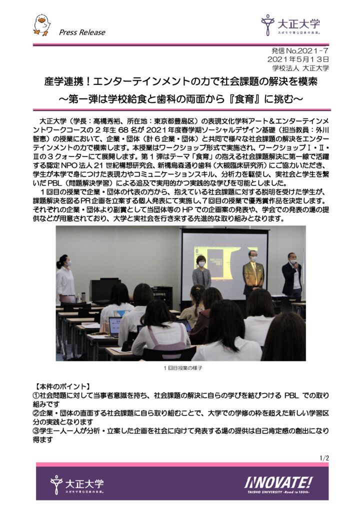 大正大学の表現文化学科アート&エンターテインメ ントワークコースの 2 年生 68 名が 2021年度春学期ソーシャルデザイン基礎(担当教員:外川 智恵)の授業において、企業・団体(計 6 企業・団体)と共同で様々な社会課題の解決をエンター テインメントの力で模索します。本授業はワークショップ形式で実施され、ワークショップⅠ・Ⅱ・ Ⅲの 3 クォーターにて展開します。第 1 弾はテーマ「食育」の抱える社会課題解決に第一線で活躍 する認定 NPO 法人 21 世紀構想研究会、新橋烏森通り歯科(大槻臨床研究所)にご協力いただき、 学生が本学で身につけた表現力やコミュニケーションスキル、分析力を駆使し、実社会と学生を繋 いだ PBL(問題解決学習)による追及で実用的かつ実践的な学びを可能としました。 1回目の授業で企業・団体の代表の方から、抱えている社会課題に対する説明を受けた学生が、 課題解決を図るPR企画を立案する個人発表にて実施し、7回目の授業で優秀賞作品を決定します。 それぞれの企業・団体より副賞として当団体等の HP での企画案の発表や、学会での発表の場の提 供などが用意されており、大学と実社会を行き来する先進的な取り組みとなります。