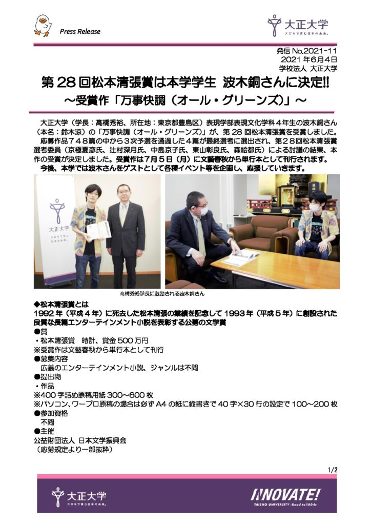 大正大学表現学部表現文化学科4年生の波木銅さん(本名:鈴木涼)の「万事快調(オール・グリーンズ)」が、第28回松本清張賞を受賞しました。