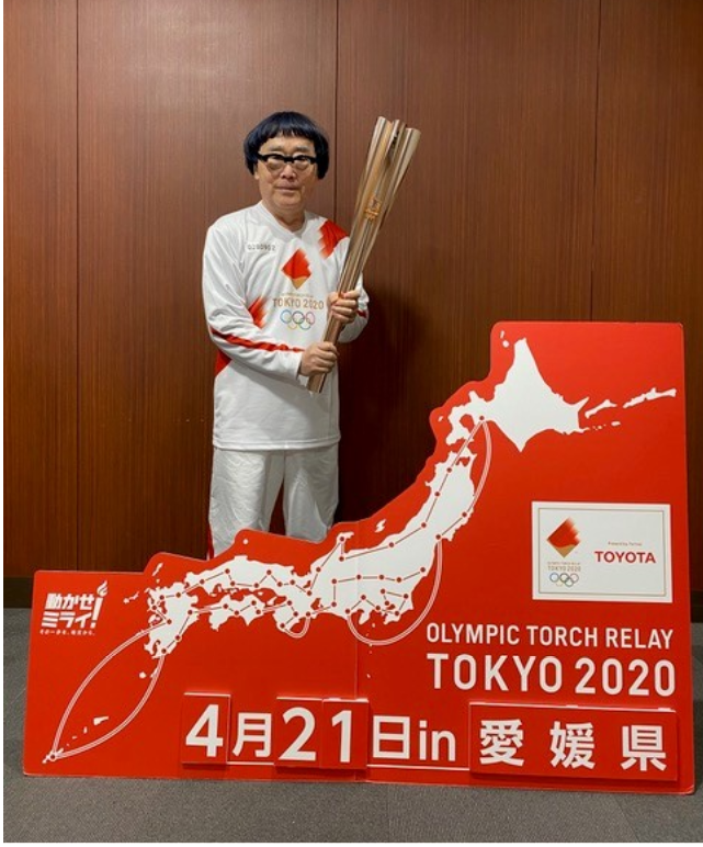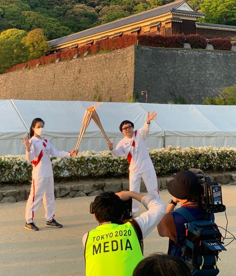 【教員の活躍】榎本了壱教授(表現文化学科)が4月21日(水)愛媛県松山市で東京オリンピック聖火の点火イベントに参加しました