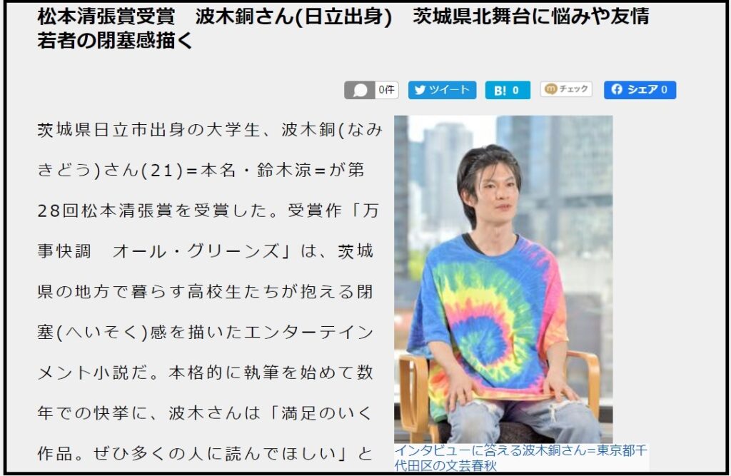 波木銅さん(表現文化学科4年)が茨城新聞の取材を受け、松本清張賞受賞作「万事快調 オール・グリーンズ」の決定報告時の様子などを語りました。