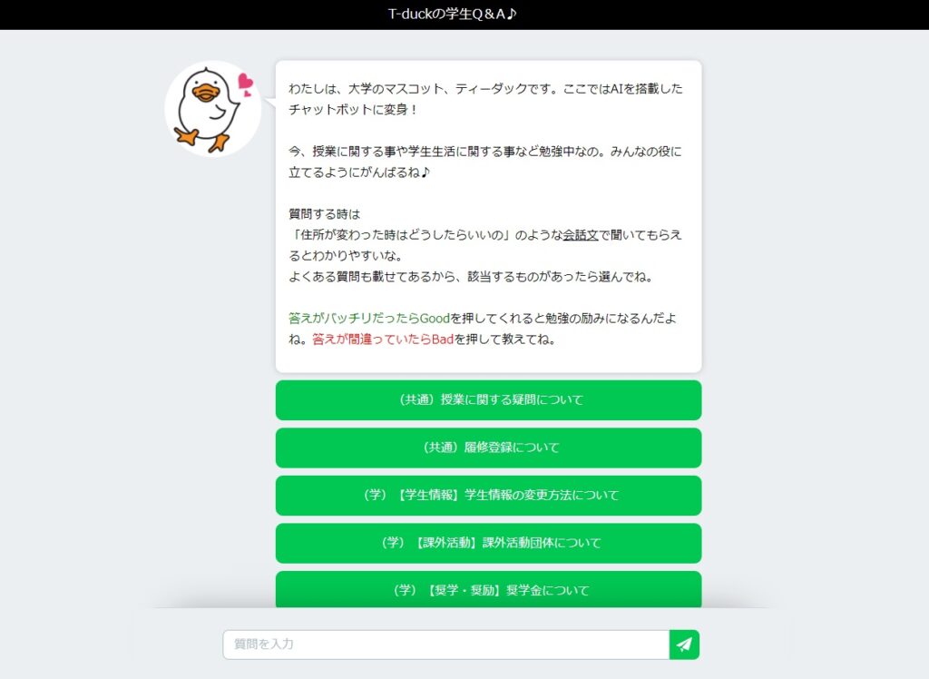 T-Poや、HPの「在学生の方」ページのT-DUCKアイコンをクリック頂くと、チャットボットページが開けます。