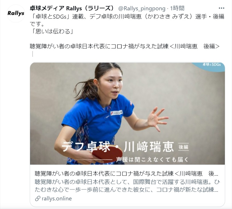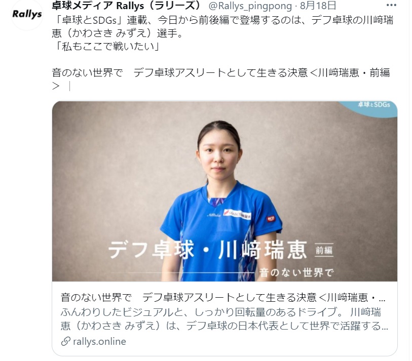 前編と後編に分かれており、前編は在学中から現在に渡り、活躍し続ける川崎さんがデフ卓球アスリートとして活躍するまでの道のりを語っています。後編では聴覚障害をもつ彼女の、コロナ禍での弊害や壁に立ち向かい続けながらも、一歩一歩突き進む前向きな姿勢が取材されています。