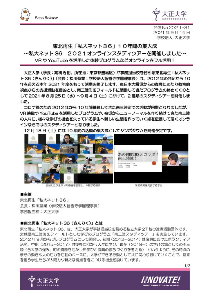 【プレスリリース】東北再生「私大ネット36」10年間の集大成 ~私大ネット36 2021オンラインスタディツアーを開催しました~ VRやYouTubeを活用した体験プログラムなどオンラインをフル活用!