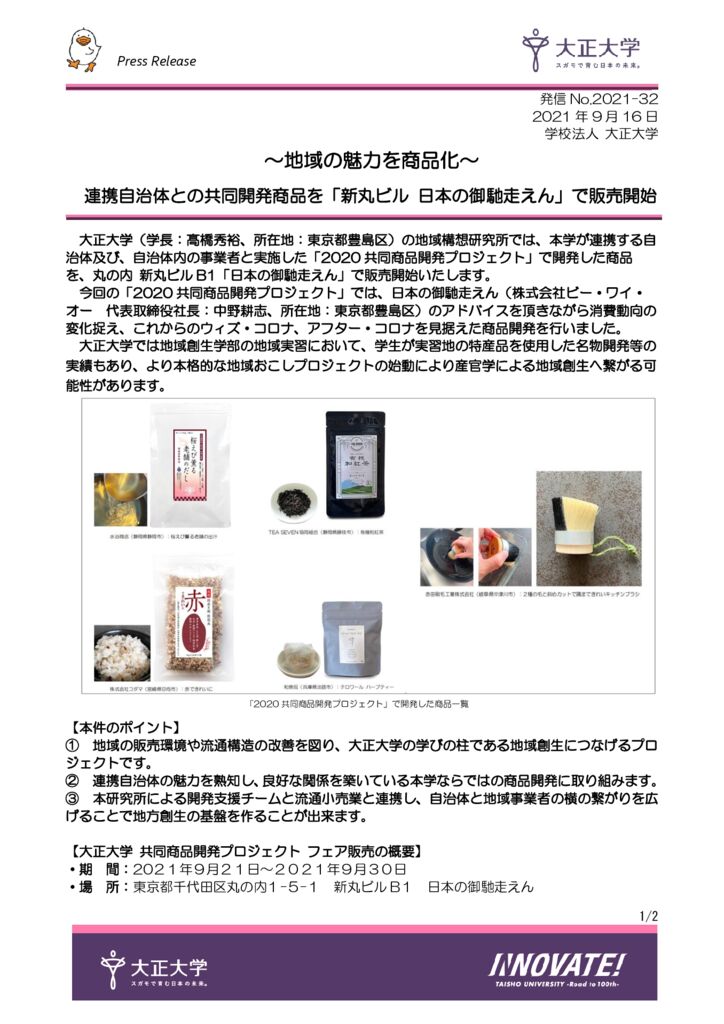大正大学(学長:髙橋秀裕、所在地:東京都豊島区)の地域構想研究所では、本学が連携する自治体及び、自治体内の事業者と実施した「2020共同商品開発プロジェクト」で開発した商品を、丸の内 新丸ビルB1「日本の御馳走えん」で販売開始いたします。