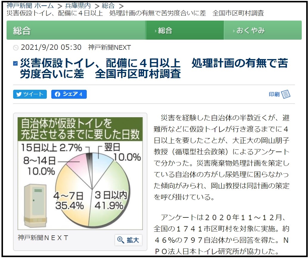 災害時に仮設トイレの調達経験がある自治体であってもトイレが行き渡るまでに4日以上を要するそうです。