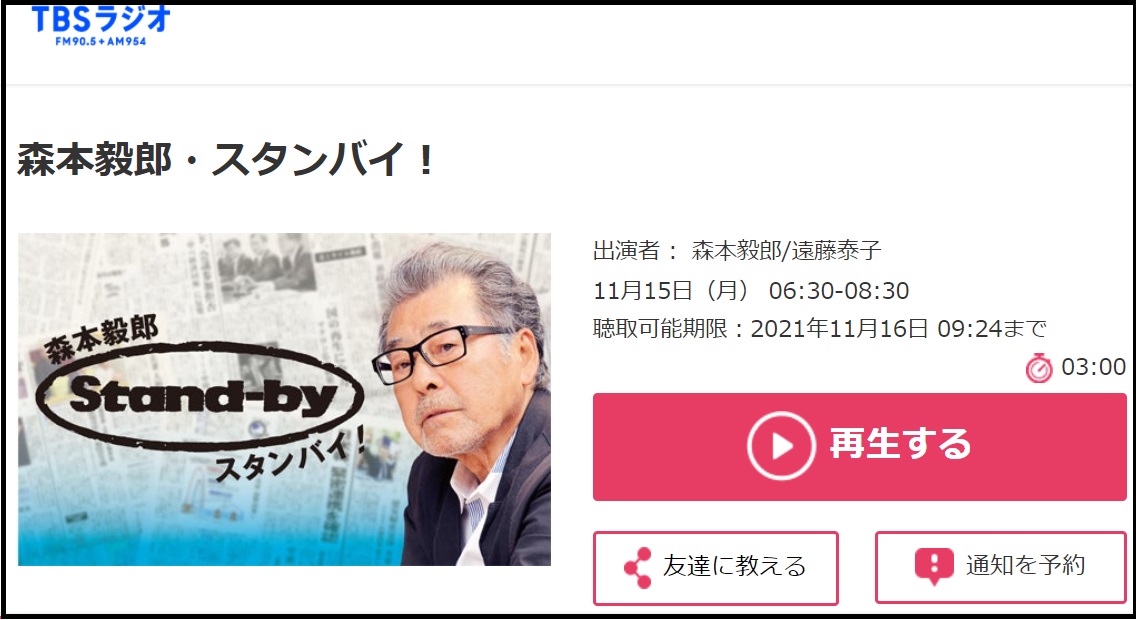 ▽こちらからTBSラジオ「森本毅郎・スタンバイ!」を「radiko(ラジコ)」で視聴可能です(Webより引用)