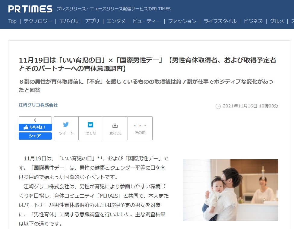 田中俊之准教授(人間科学科)が11月19日の「いい育児の日」(※)、および「国際男性デー」を前に、江崎グリコ株式会社が実施した「男性育休」に関する意識調査(本人またはパートナーが男性育休取得済みまたは取得予定の男女を対象)に携わりました。
