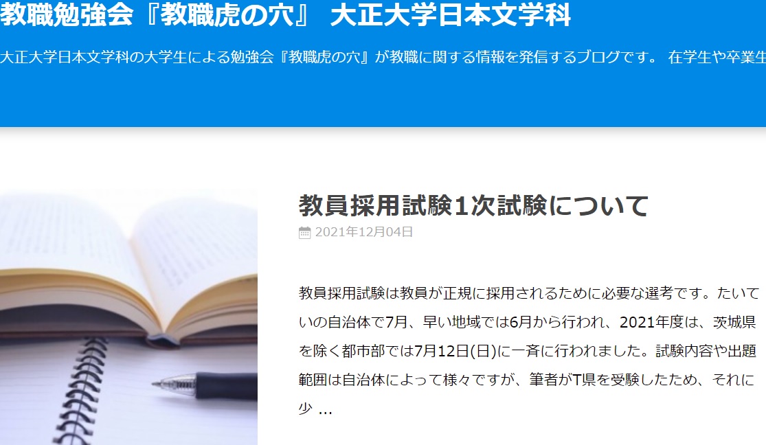 11月25日より、学生・卒業生が手掛ける「教職勉強会『教職虎の穴』」で学習している模擬授業や勉強会といった日々の活動報告の他、教員採用選考や教育実習などに関する情報の共有などを行っていくブログが開設されました。