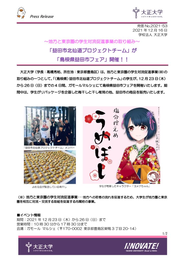 大正大学は、地方と東京圏の学生対流促進事業(※)の取り組みの一つとして、「(島根県)益田市北仙道プロジェクトチーム」の学生が、12月23日(木)から26日(日)までの4日間、ガモールマルシェにて島根県益田市フェアを開催いたします。期間中は、学生がリパッケージを企画した梅干しと干し椎茸の他、益田市の商品を販売いたします。 ▽こちらから開けます