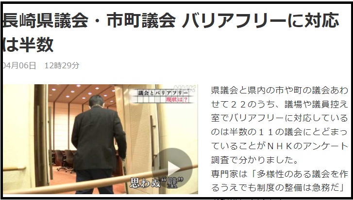 江藤俊昭教授(公共政策学科)がNHKより取材を受け、長崎県議会と県内の市や町にある22の議会事務局のバリアフリー化についてのアンケートを基に地方議会の現状に詳しい専門家としてコメントしました。※江藤俊昭教授について(本学教員情報より)