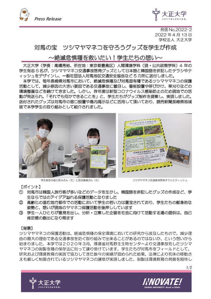 大正大学 人間環境学科(現・公共政策学科)4年の学生有志5名が、ツシマヤマネコ交通事故啓発グッズとして日本語と韓国語を併記したチラシやティッシュをデザインし、一般社団法人対馬地区交通安全協会など5カ所に送付しました。