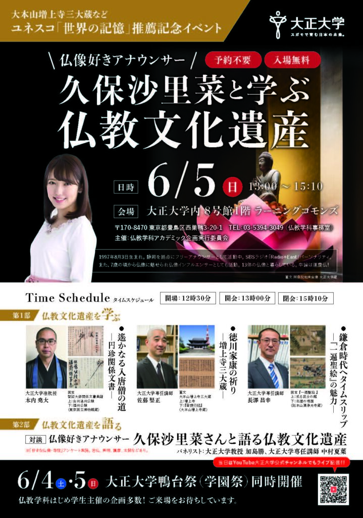 仏教学部仏教学科では、6月5日(日)に「仏像好きアナウンサー久保沙里菜と学ぶ仏教文化遺産」を開催します。