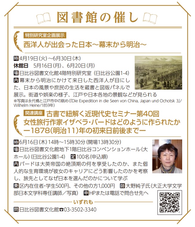 大野純子専任講師が日比谷図書文化館にて開催される『特別研究室企画展示 西洋人が出会った日本~幕末から明治~』の関連講座「古書で紐解く近現代史セミナー第40回 女性旅行作家イザベラ・バードはどのように作られたかー1878(明治11)年の初来日前後までー」の講師を務めます。日時:6月16日(木)14時から15時30分まで(開場13時30分)